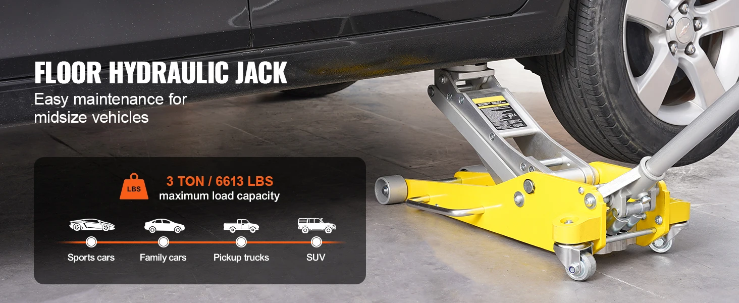 3T Maximum Weight: Our floor jack easily lifts up to 3 tons / 6613 lbs, accommodating sports cars, family sedans, light and mid-sized trucks, and SUVs. Whether you’re a professional mechanic or a DIY enthusiast, lifting vehicles is effortless.