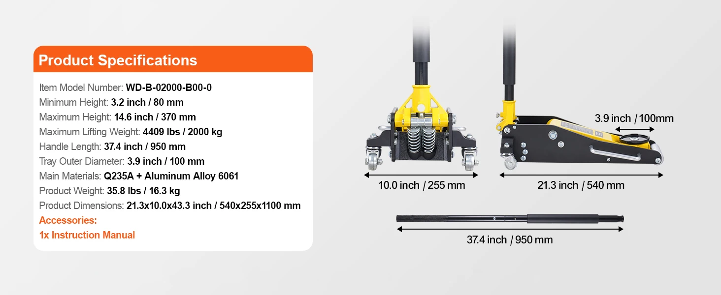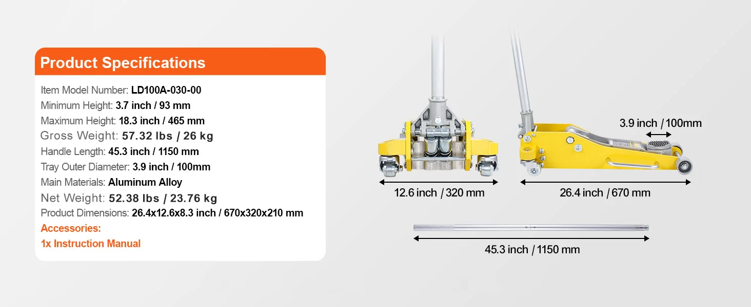 Versatile Lifting Heights: With a minimum lift height of 3.7 inches / 93 mm and a maximum lift height of 18.3 inches / 465 mm, this low profile floor jack covers a broad lifting range. It provides ample height to lift vehicles for tasks such as tire changes, brake system inspections/repairs, exhaust system replacements, suspension work, and other undercarriage maintenance. Simply rotate the jack handle counterclockwise to lower the vehicle.