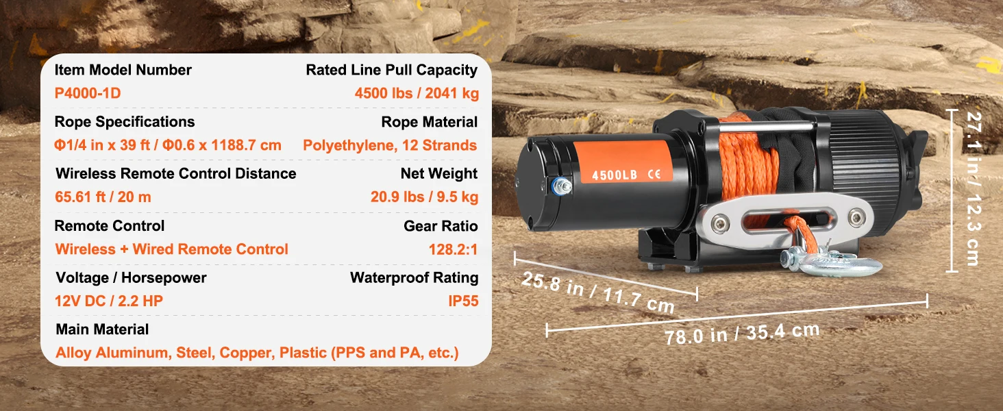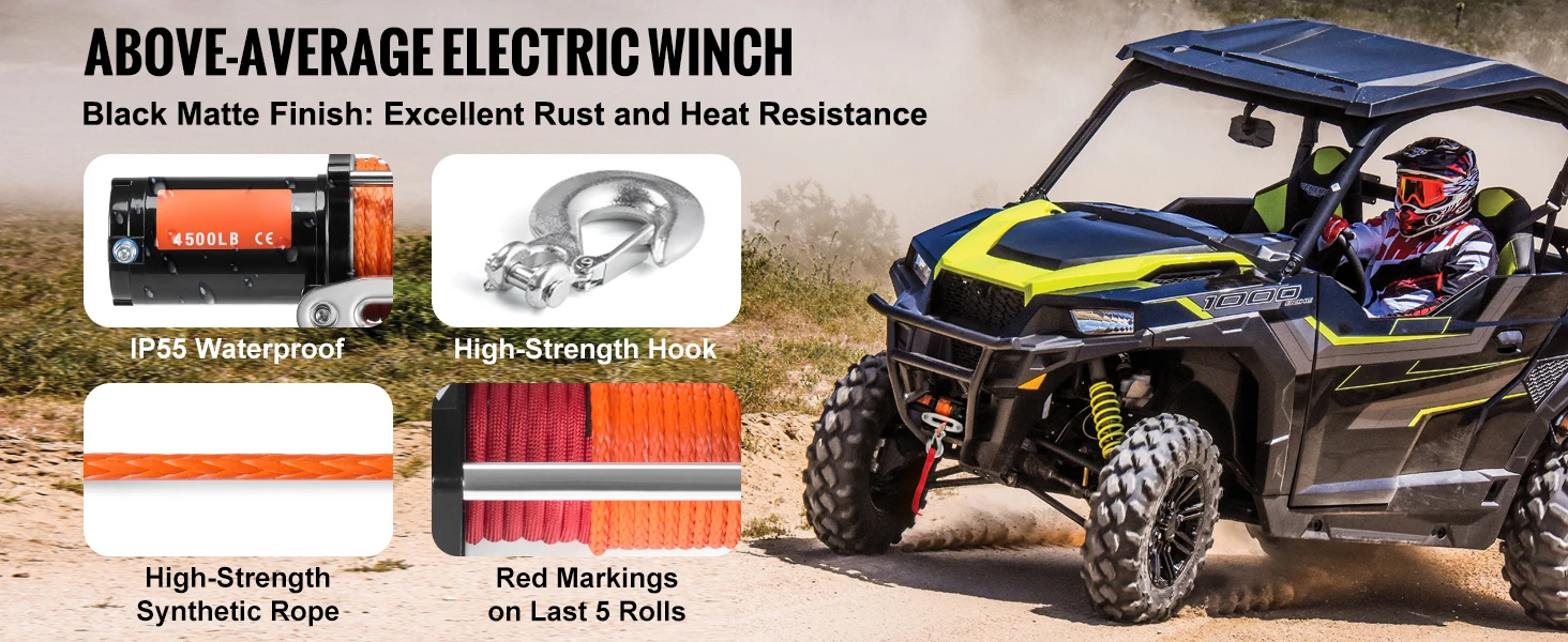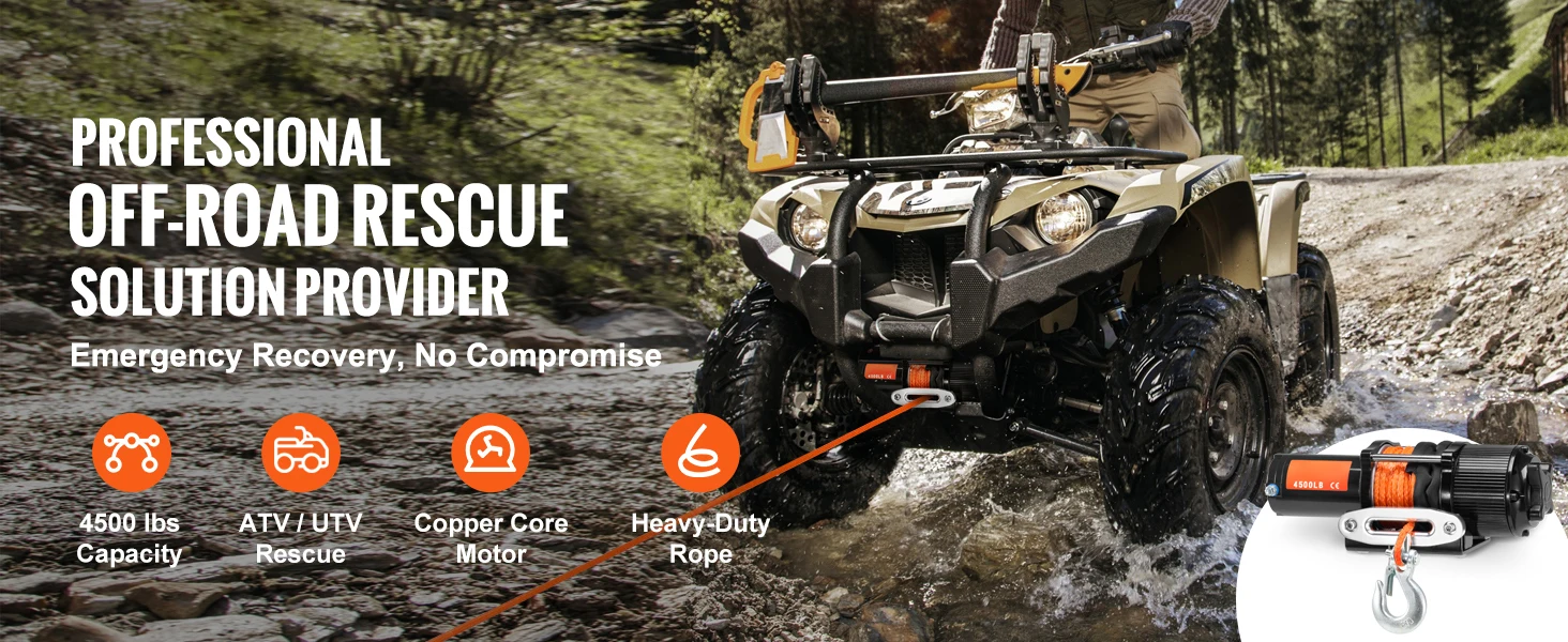 Your Vehicle's Backup Power: Designed specifically for off-road recovery, our heavy-duty electric winch offers a powerful 4500 lbs of line pull capacity. When your vehicle gets stuck in mud or caught in a downpour, this winch provides the extra drive you need to get back on track quickly. Ideal for towing jobs for small vehicles such as ATVs and UTVs, ensuring your adventures never come to a halt.