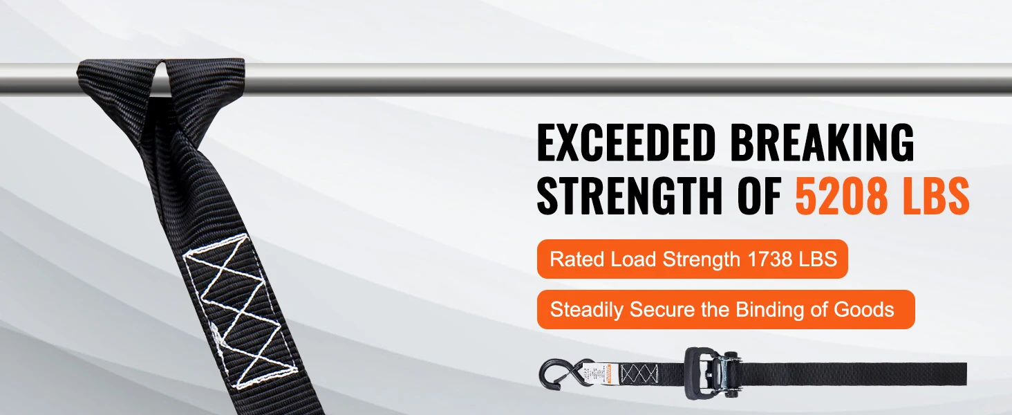 Powerful 2200/5208 lbs Breaking Strength: The webbing is made of high-quality material with additional stitching, providing unbeatable performance even when handling heavy loads in strong winds. Each ratchet has an official load capacity of 733/1738 lbs and a breaking strength of up to 2200/5208 lbs