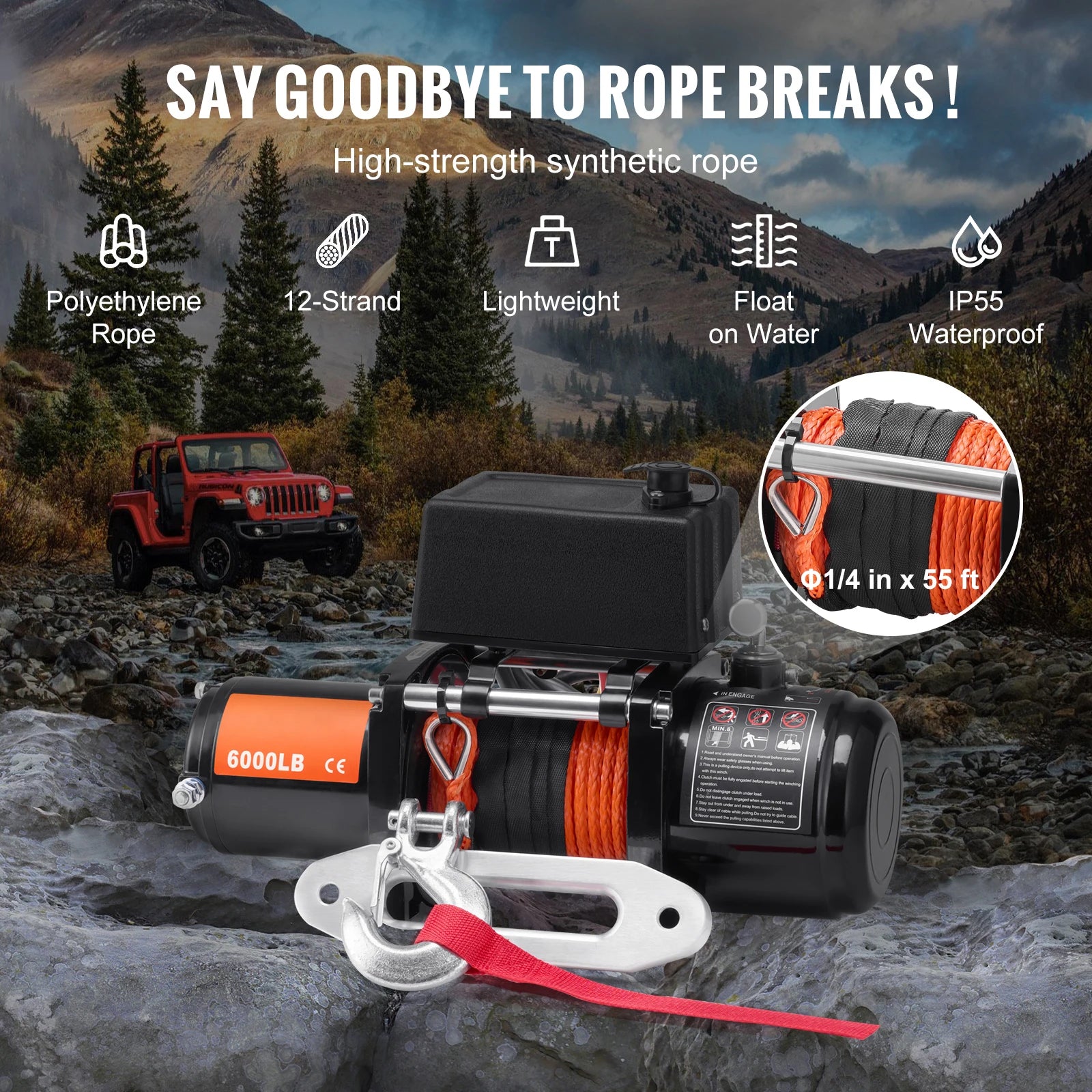 SucceBuy 6000lbs Electric Winch Car Truck Winch with 1/4 in 55 ft Synthetic Rope Wireless/Wired for Towing SUV Jeep Trailer Boat