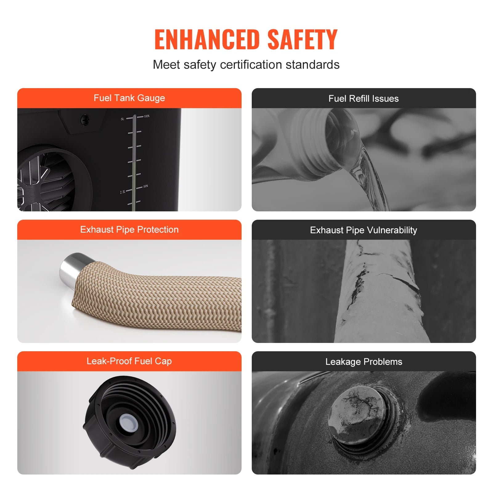 Innovative CO Alarm System: Our diesel heater features enhanced safety with a built-in CO alarm that continuously monitors CO levels, providing alerts or auto shut-off when needed. Additional upgrades include a leak-proof fuel tank cap, fuel level indicator, and overheat protection—ensuring peace of mind during extended use.