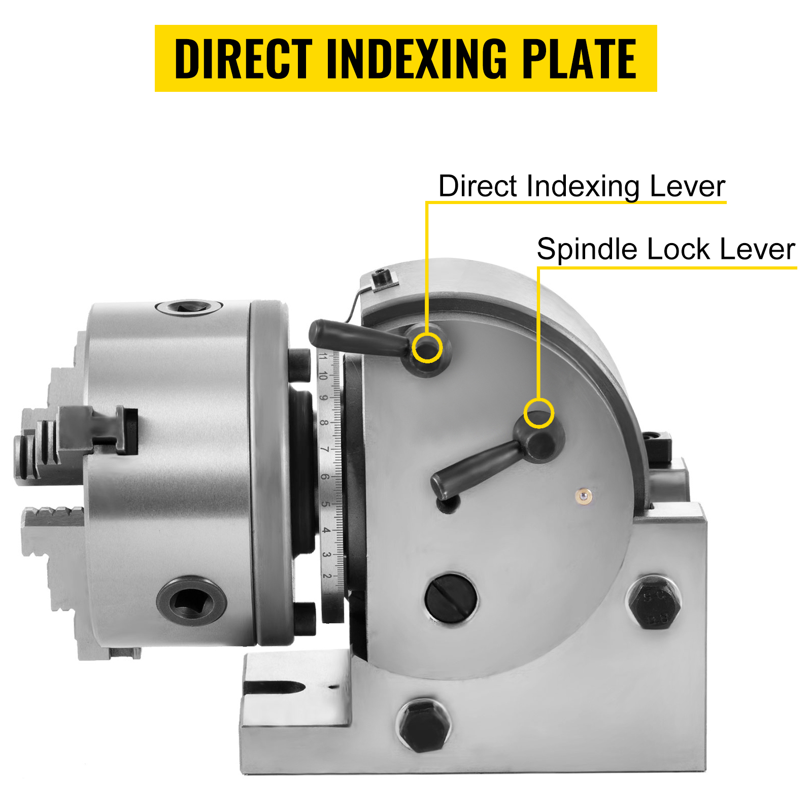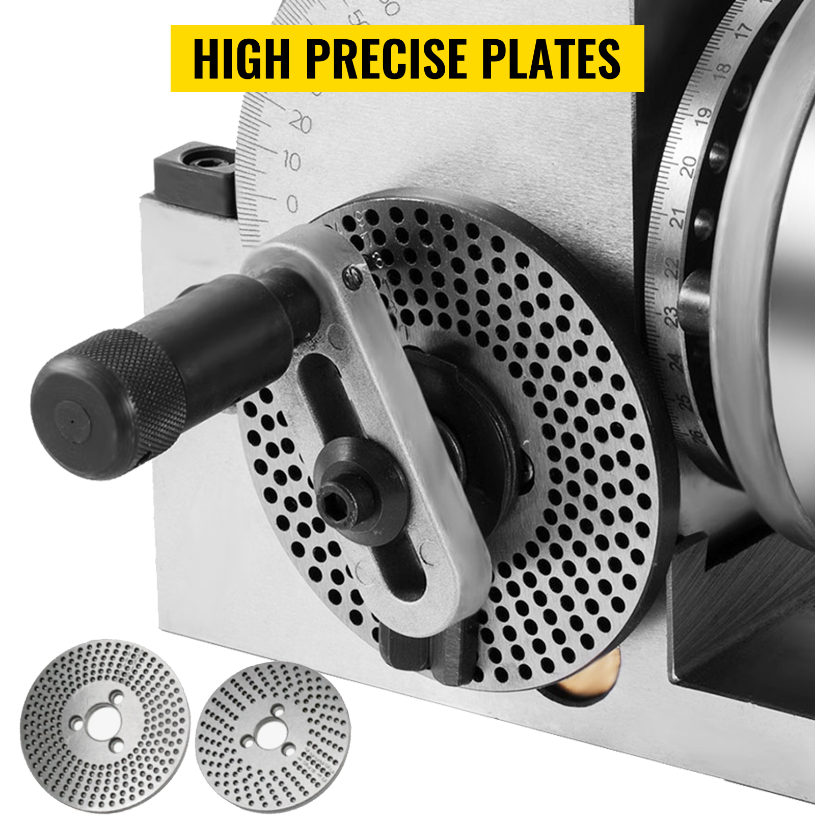 High Precision Indexing Plate: The universal dividing head features a precise indexing plate system, including a direct indexing plate, an interchangeable plate, and two additional interchangeable plates with varying hole counts. These components ensure accurate division and spacing for precise cutting operations.