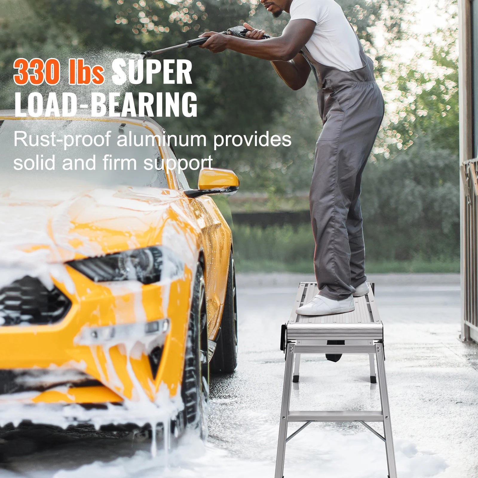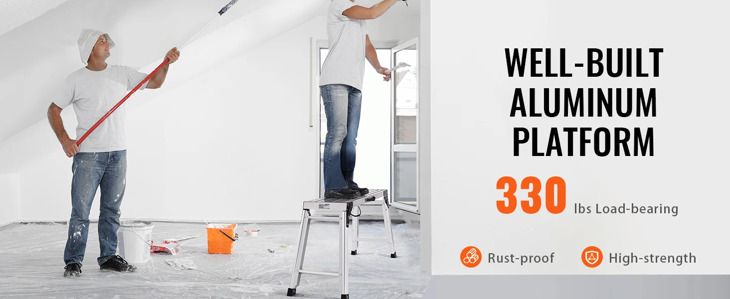 Ultimate Durable Aluminum: Our folding platform is crafted from top-notch aluminum, ensuring resistance to rust and corrosion. Our platforms feature an impressive load capacity of up to 330 lbs, effortlessly bearing the weight of heavy equipment, materials, and tools.