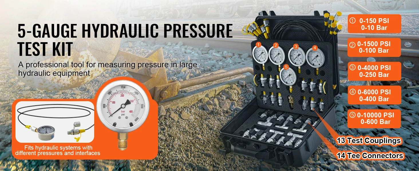 Wide Industrial Applications: Our hydraulic pressure test kit is ideal for excavators, hydraulic presses, cranes, compressors, and various large hydraulic equipment; this pressure test gauge finds applications in construction, shipping, mining, smelting, maintenance, and more. The hydraulic test gauge kit is the go-to choice for professional testing in diverse industries.