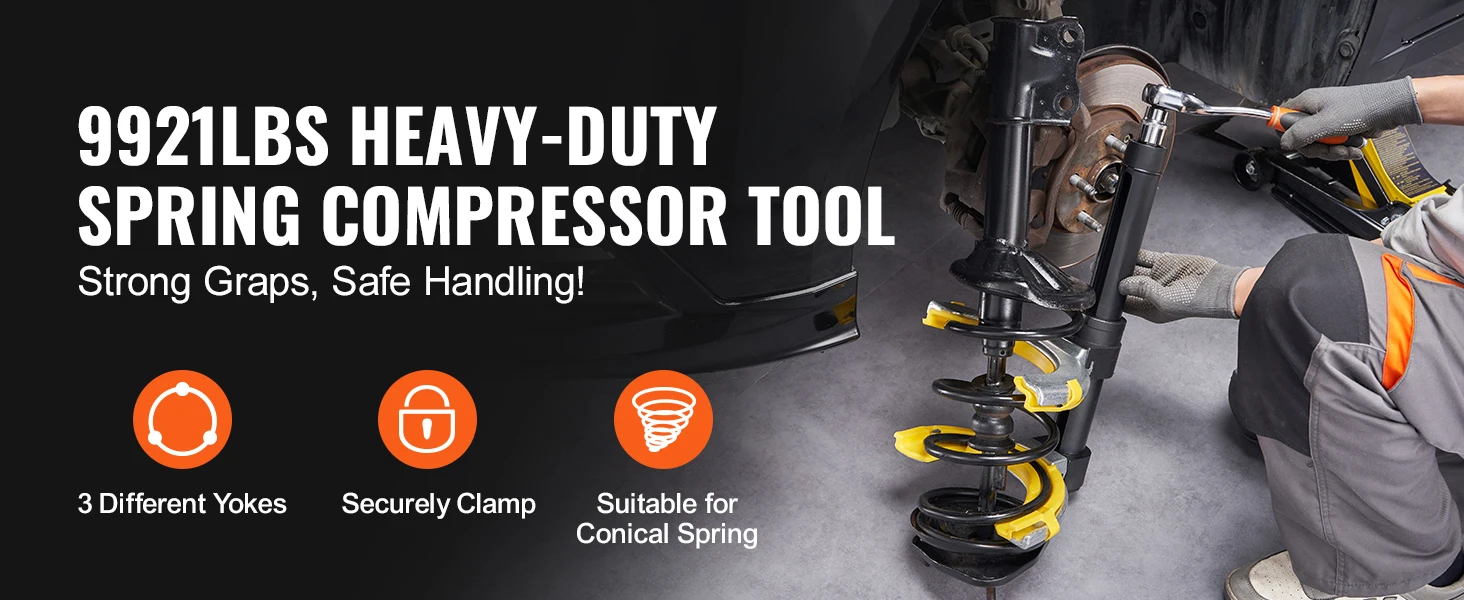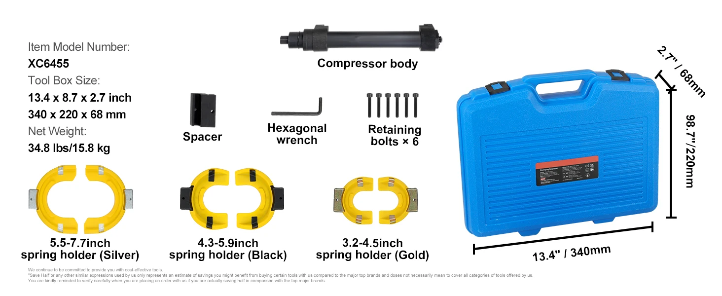 3 Interchangeable Yokes: With three yoke options, our spring strut compressor fits various vehicle models: Gold: 2.6-4.9 inch spring holder (compression range: 2.6-11.8 inches); Black: 3.4-6.3 inch spring holder (compression range: 3.3-12.8 inches); Silver: 4.9-8.3 inch spring holder (compression range: 3-12.6 inches).