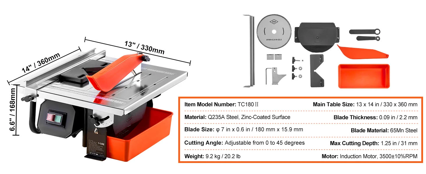 0-45° Angle and Deep Cutting: The VEVOR wet tile saw provides adjustable cutting angles from 0 to 45 degrees. The maximum cutting depth is 1.25 inches / 31 mm. Equipped with a thick 65Mn steel blade and a high-speed 3500 RPM induction motor, it can effortlessly cut various tiles, stones, and ceramics.