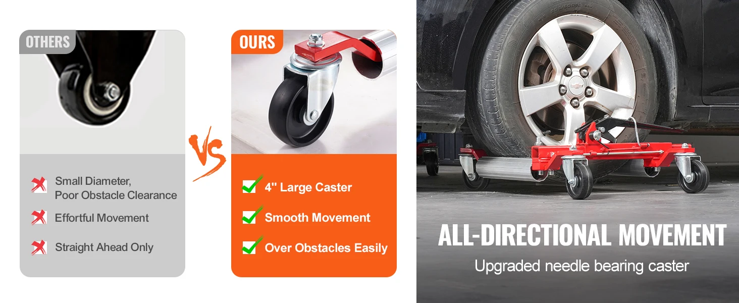 360° Movement: Equipped with 4-inch swivel casters, this vehicle dolly ensures smooth and unobstructed movement on various surfaces. The nylon material combined with needle bearings enhances durability and provides additional toughness, ensuring long-term use without damage or detachment.