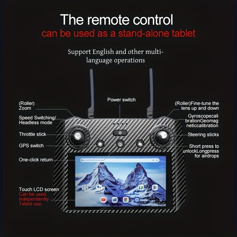 This item is ideal for users involved in aerial photography during travel, shooting short videos, casting fishing bait, and filming outdoor activities, among others. Key characteristics of the item include: @ A 5.5-inch touchscreen remote control that can connect to the internet and download the application @ An automatic dropping mechanism that enables remote loading and releasing of items, with a maximum weight capacity of 500 grams. It is intended solely for casual entertainment.