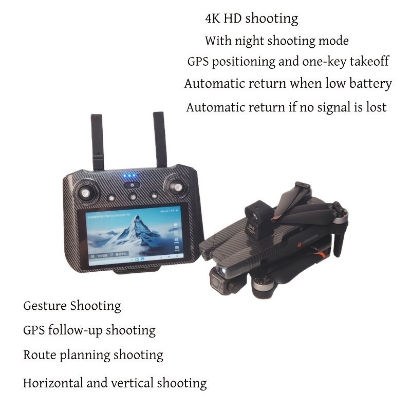 A 4K camera equipped with zoom capabilities, a mode for night photography, and digital video transmission. The remote control can operate at a maximum distance of 8 kilometers and can reach heights of up to 800 meters, with a single battery providing 30 minutes of flight time. It features GPS positioning, one-touch takeoff and landing, automatic return when the battery is low, and return upon losing connection. It supports gesture control for shooting, offers both portrait and landscape modes, GPS tracking for shooting, and allows for flight path planning. Additionally, it includes a 360-degree laser obstacle detection system and can withstand winds up to level 7.