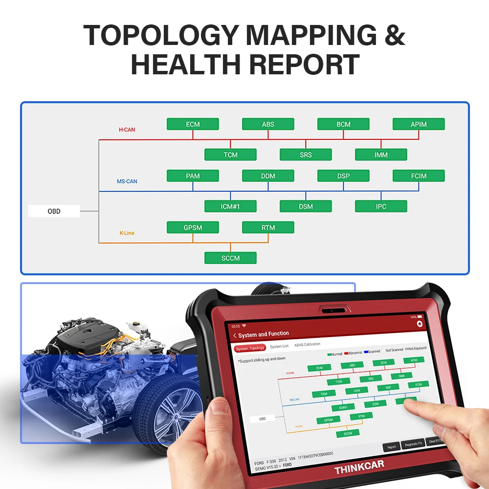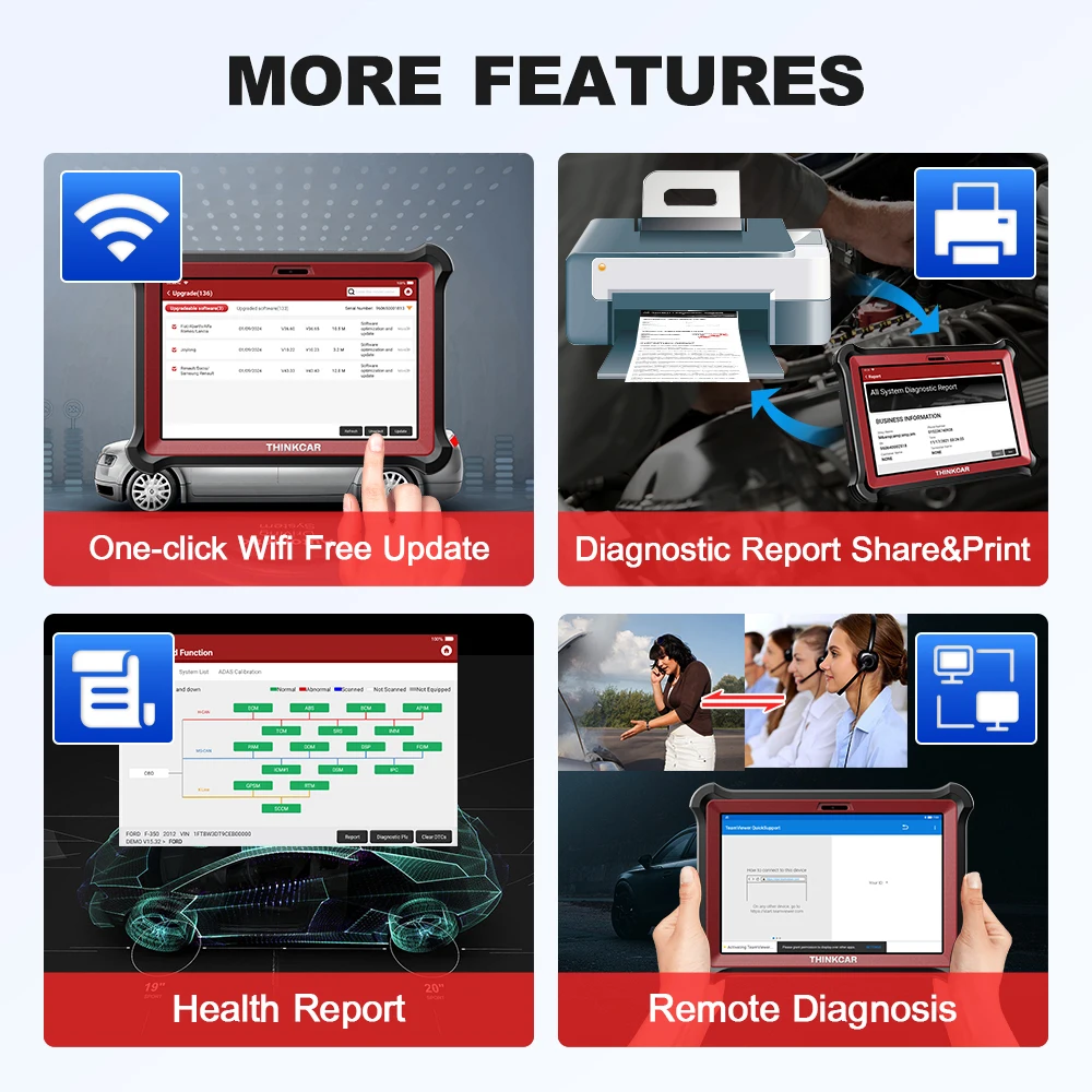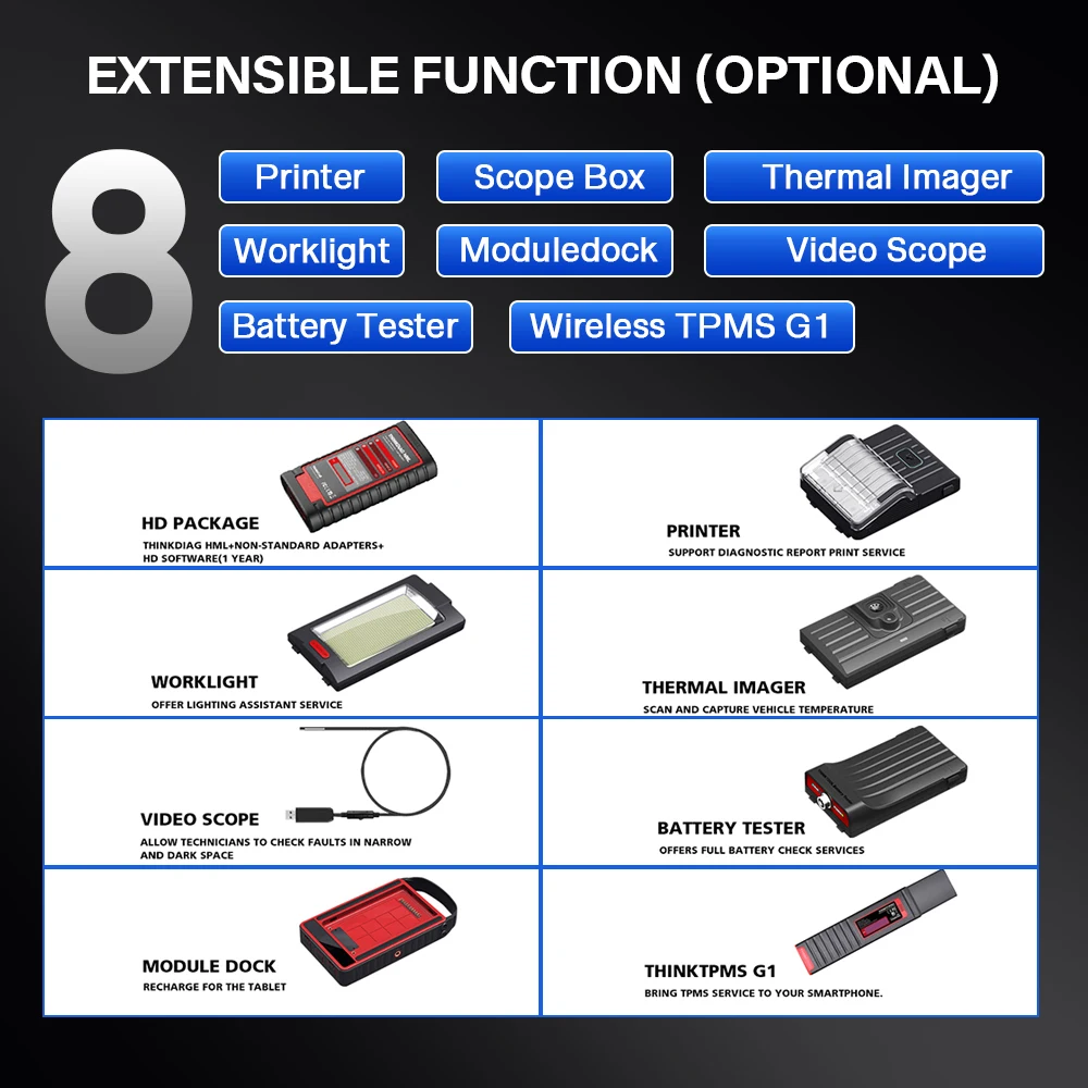 [Support 8 Extra Diagnosis Module from Thinkcar + All system Topology Display + Tire Pressure Program] Work with 8 modules (printer, work lamp, endoscope, battery detection, oscilloscope, thermal imaging, charging base, wireless tire pressure diagnosis tool), for professional technicians. Using the tire pressure diagnosis module, you can learn/program/match the tire pressure.