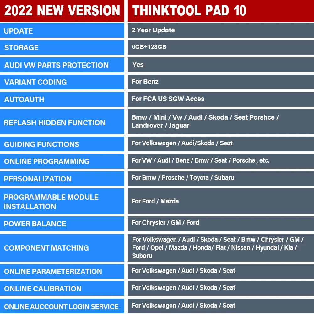 [2022 New Thinktool PAD10, Work with HD Module] OE-Level features➤ADAS Calibration (need Thinkcar ADAS calibration rack)➤AutoAuth for FCA SGW which makes Thinktool Pad10 works with Chrysler, Dodge, Jeep, Alfa Romeo and Fiat after 2017.➤Setting & Changeover (adblue reset, unlock the engine after collision, cancel ABS driving test, etc...) for Benz ➤Modification for BMW ➤Offline Coding ➤Customization ➤Personalization, for worldwide vehicles, and keep growing.➤ Support Heavy Duty Modules