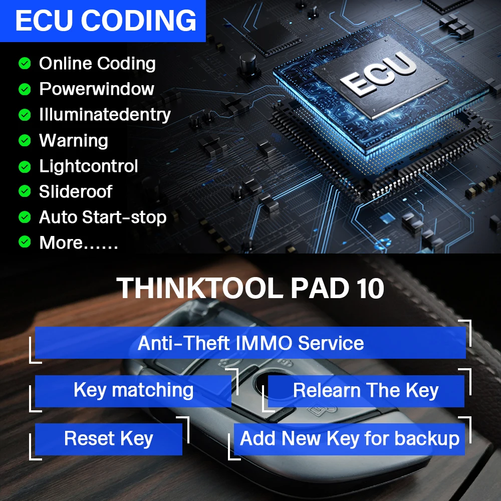 ThinkTool Pad10 supports programming and coding, which is to write the relevant control information of the software into the automotive computer's programmable EPROM or FLASH by making use of the electronic communication transmission technology.