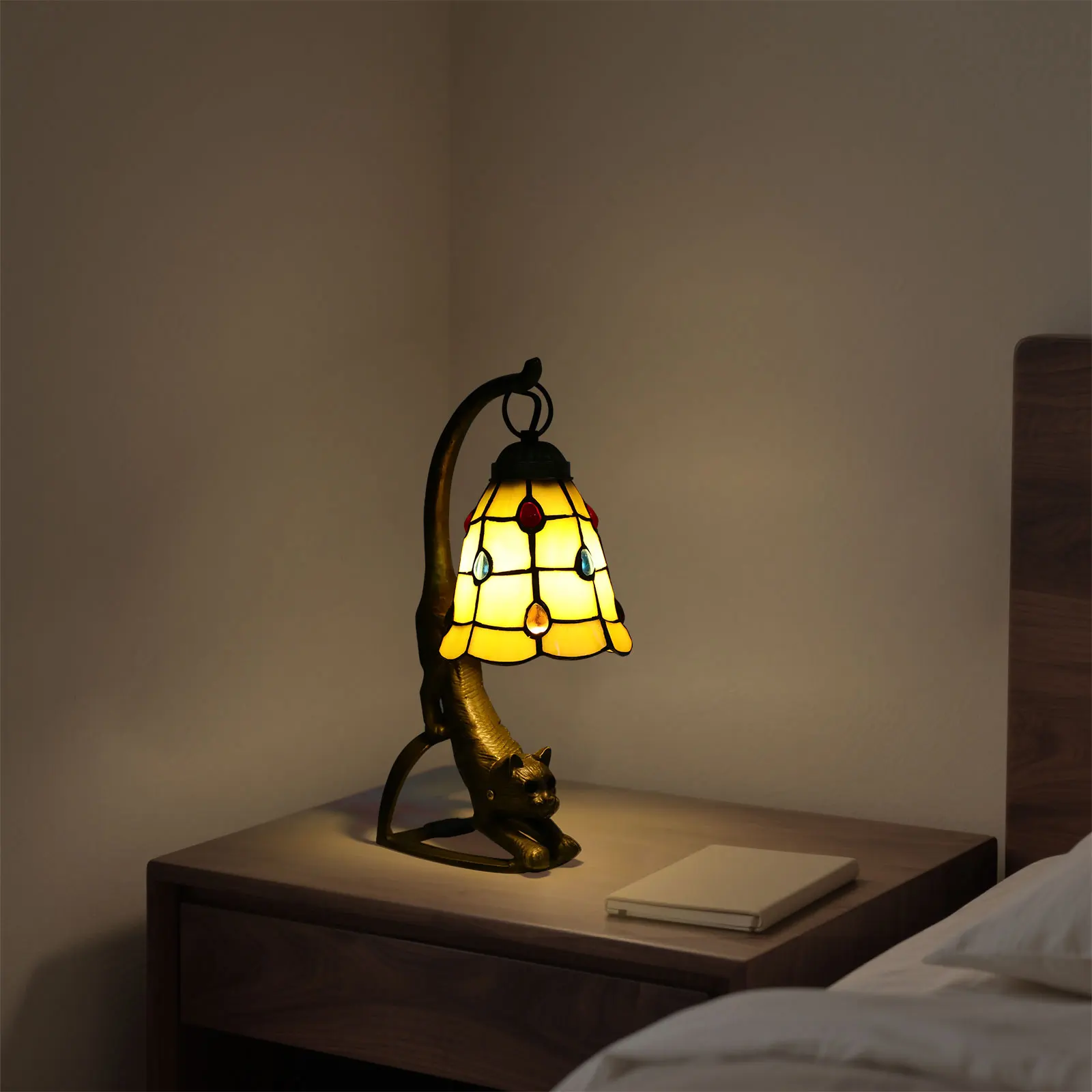 The handcrafted beige glass shadefeatures elegant cut-glass details and a whimsical cat motif, creating a warm, artistic glow that enhances any room’s decor.