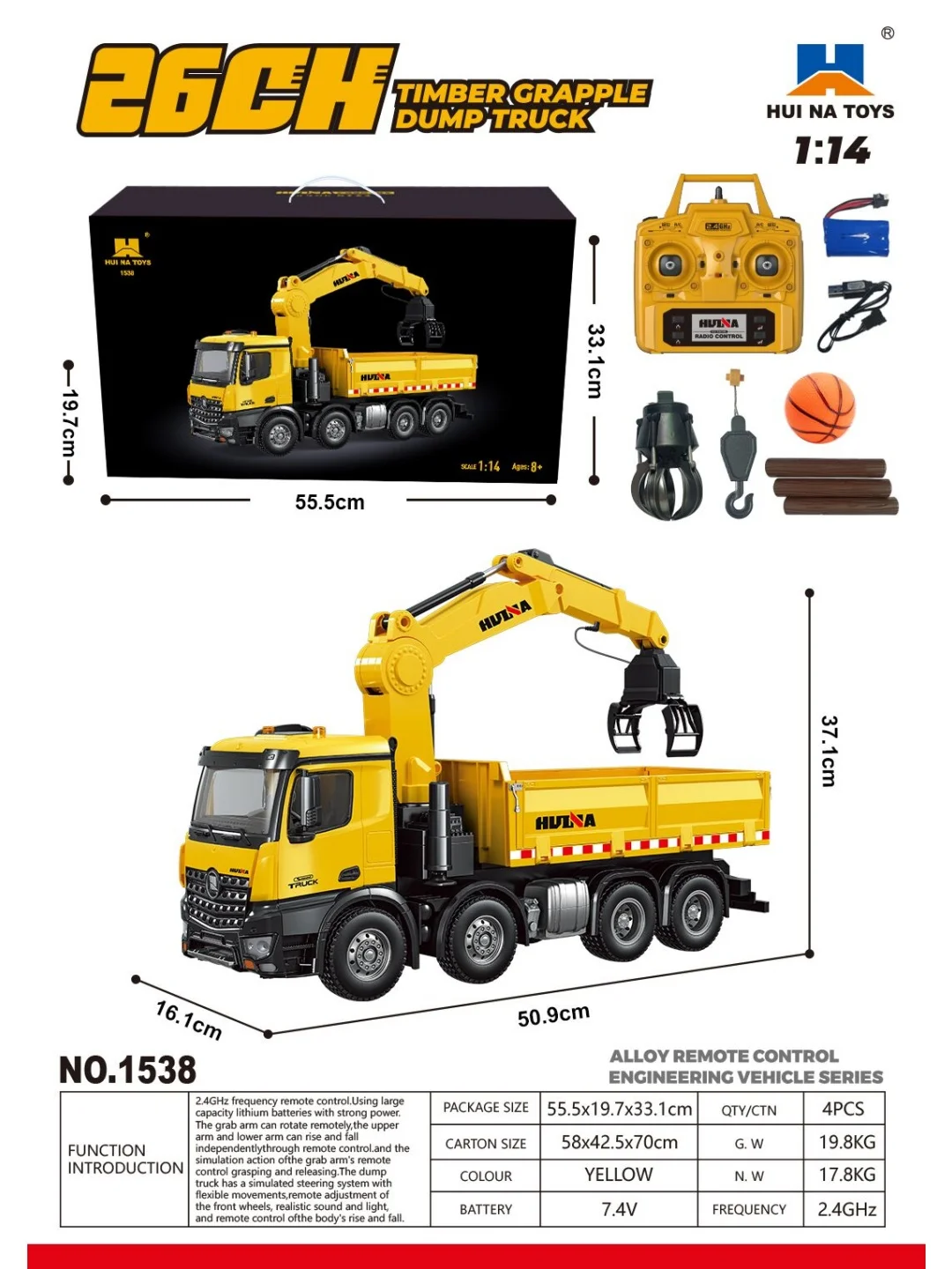2.4GHz frequency remote control. Using large capacity lithium batteries with strong power. The grab arm can rotate remotely, the upper arm and lower arm can rise and fall independentlythrough remote control. and the simulation action ofthe grab arm's remote control grasping and releasing.The dump truck has a simulated steering system with flexible movements,remote adjustment of the front wheels, realistic sound and light, and remote control ofthe body's rise and fall.