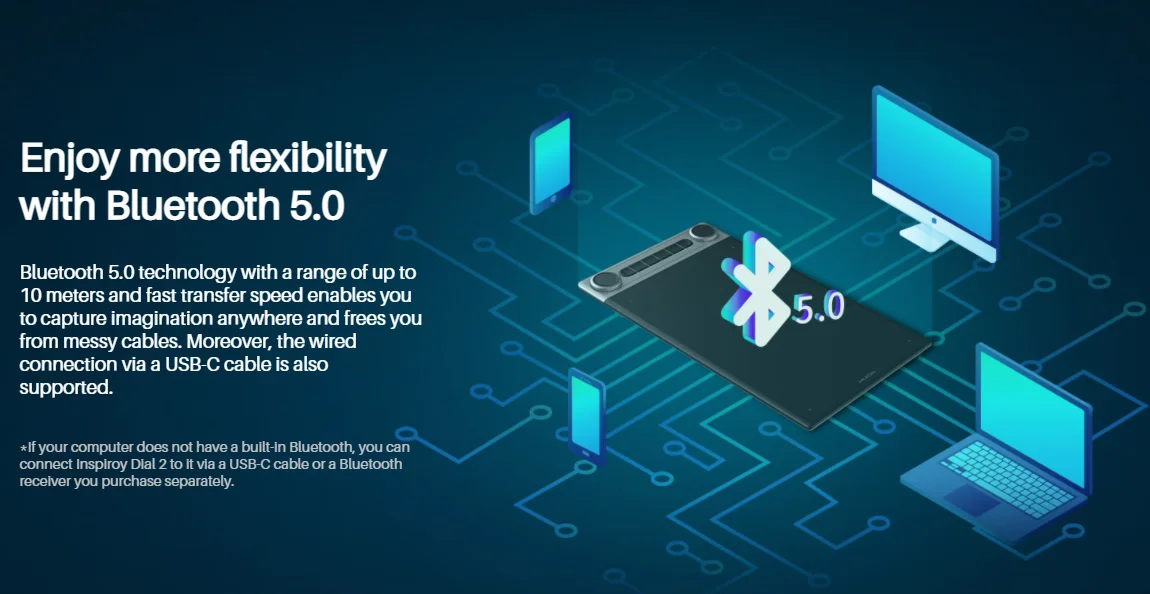 A large battery for all-day creation:1300mAh, Inspiroy Dial 2 can work for up to 18 hours in Bluetooth mode and takes as short as only 2.5 hours to reach a full charge.