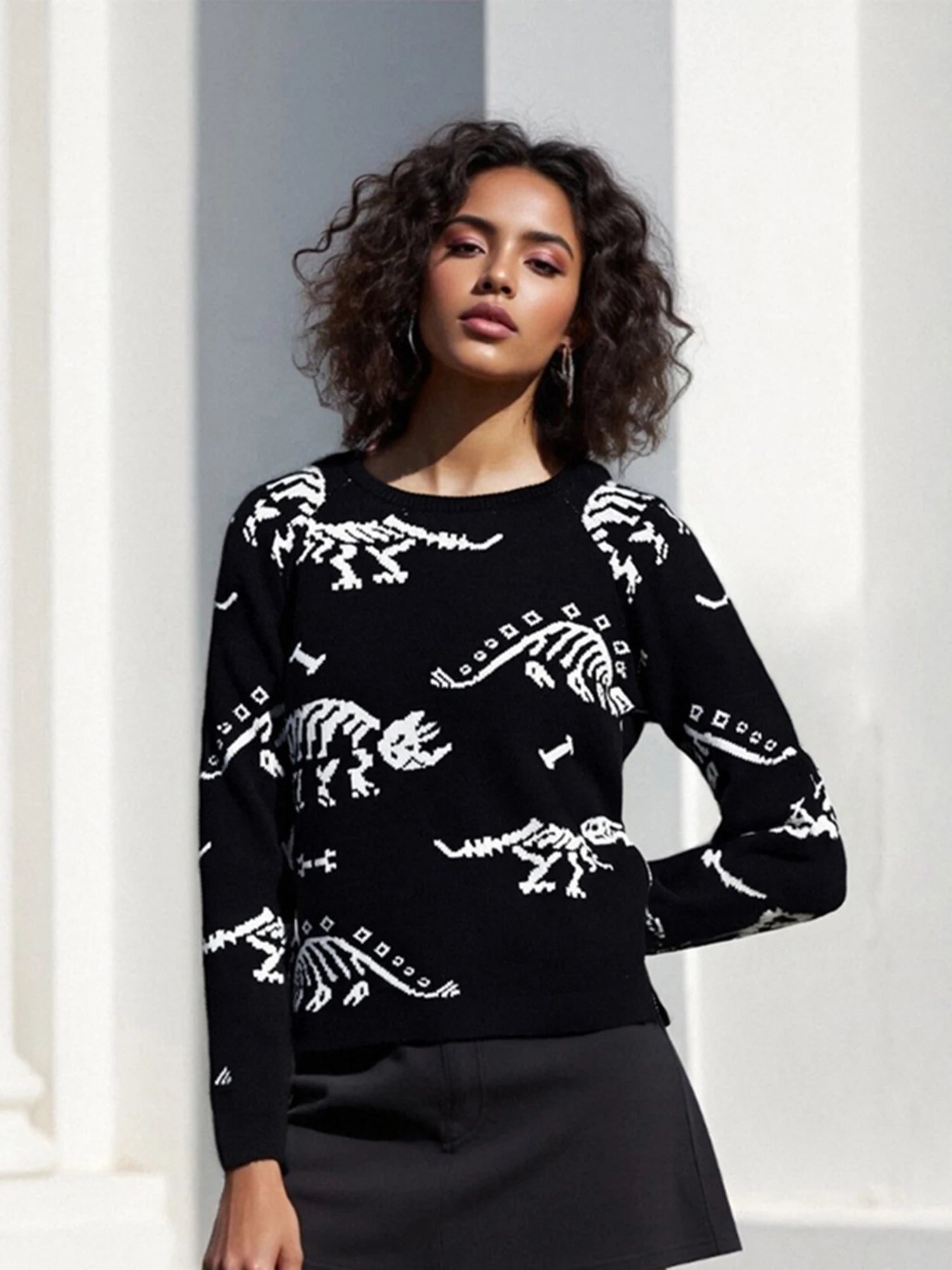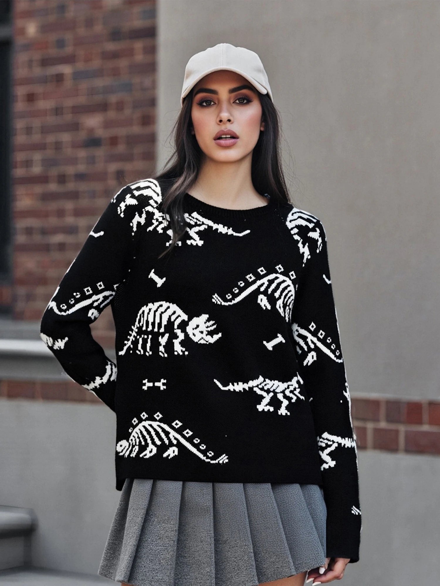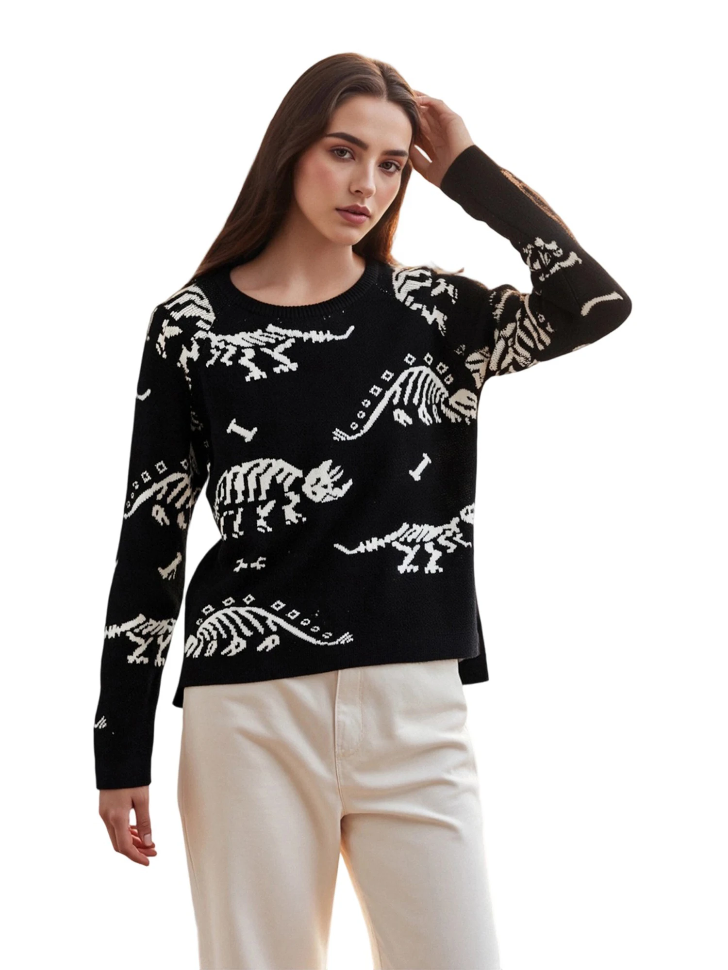 Women's Autumn Loose Sweater Cute Animal Print Long Sleeve Round Neck Knitwear PulloverSize (cm)