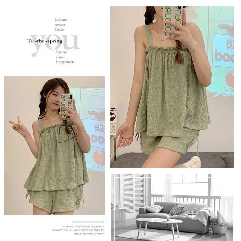 Women Summer Two Pieces Short Pajamas Suspenders Thin Sweet Cute Cotton Gilrs Homewear With Sleeveless Loose Soft Home Clothing
