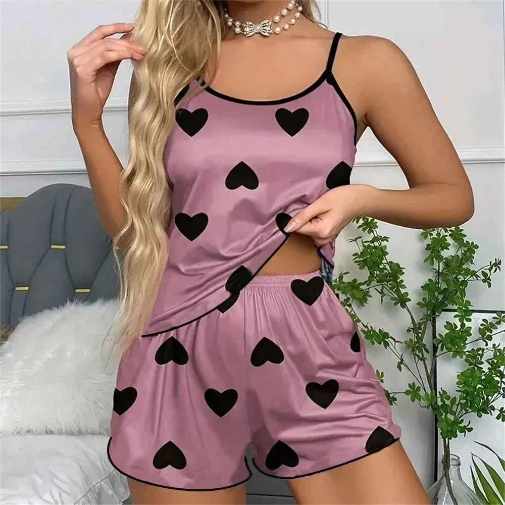 Women's Ice Silk Pajama Set – Pink Heart Print Short Sleeve T-Shirt & Shorts, Comfortable Summer Sleepwear